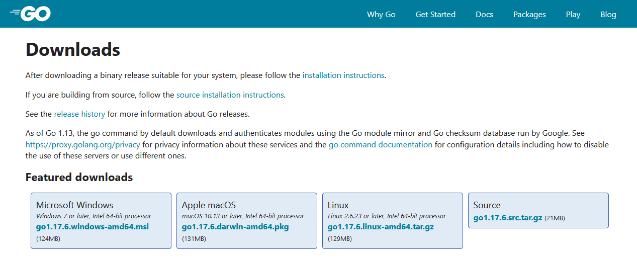 Trước hết, hãy truy cập vào go.dev/dl và chúng ta sẽ có một số tùy chọn có sẵn để tải xuống.
