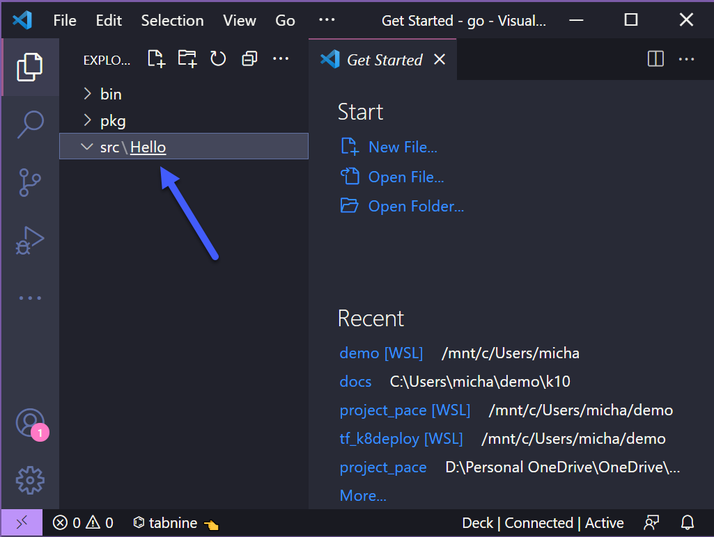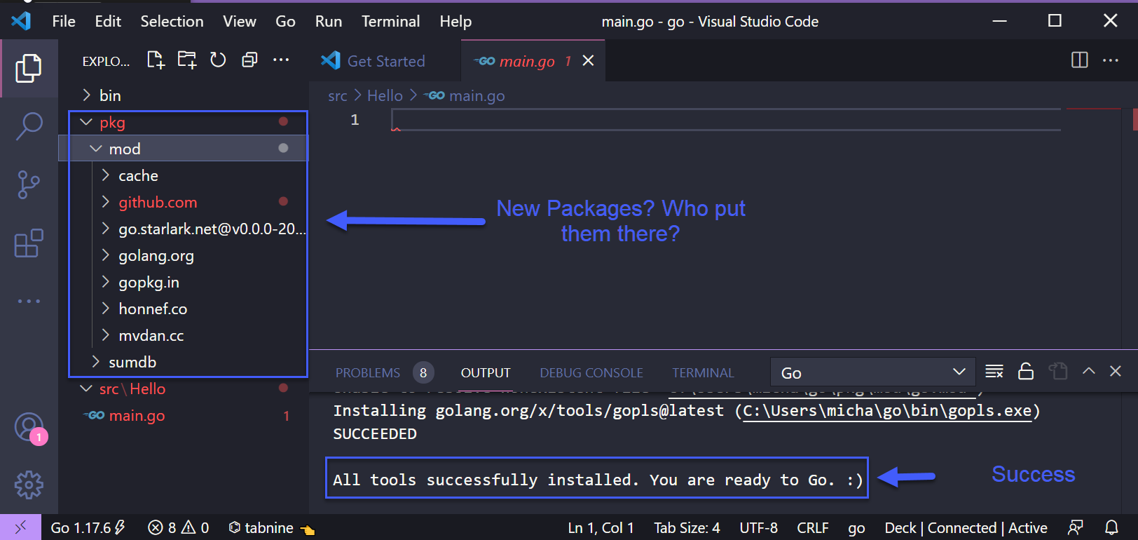 Tiếp theo, tạo một tệp có tên là main.go trong thư mục Hello. Ngay sau khi bạn nhấn Enter tại file main.go, bạn sẽ được hỏi xem bạn có muốn cài đặt tiện ích mở rộng (extension) cho Go không cũng như các các packages mới. Bạn cũng có thể kiểm tra xem liệu tệp pkg mà chúng ta đã tạo có một số packages mới trong đó hay không?