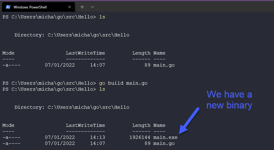 Tuy nhiên, không chỉ dừng lại tại đây, nếu chúng ta muốn chạy chương trình của mình trên các máy Windows khác thì sao? Chúng ta có thể xây dựng một tệp thực thi nhị phân bằng câu lệnh dưới đây