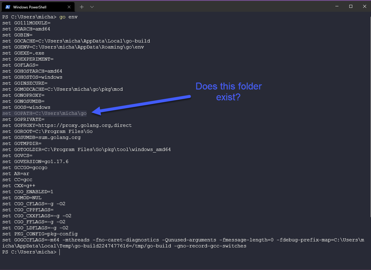 Tiếp theo, chúng ta sẽ kiểm tra môi trường cho Go để đảm bảo các việc các thư mục làm việc được cấu hình chính xác. Như bạn có thể thấy bên dưới, chúng ta cần đảm bảo rằng những thư mục sau có trên hệ thống của mình.
