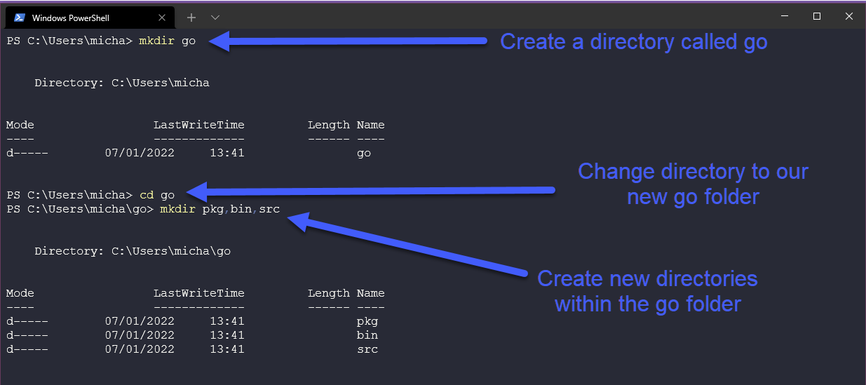 Được rồi, hãy tạo thư mục đó bằng cách sử dụng lệnh mkdir trong PowerShell terminal. Chúng ta cũng cần tạo 3 thư mục trong thư mục Go như bạn sẽ thấy bên dưới.