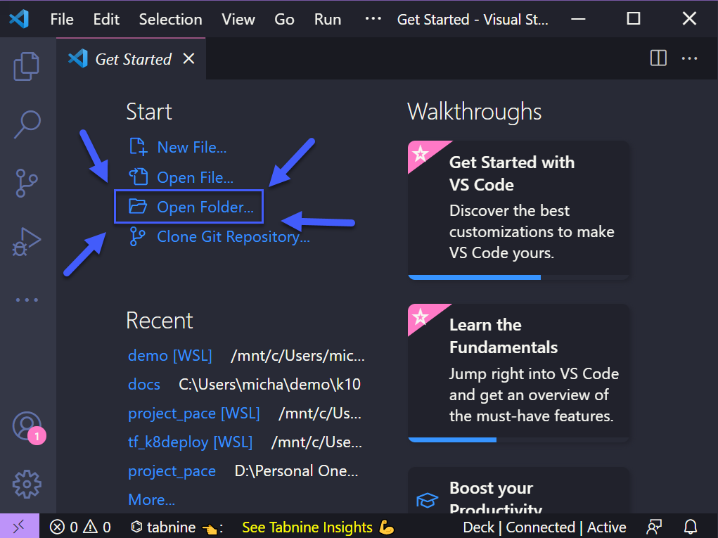 Tương tự như với việc cài đặt Go, chúng ta sẽ tải xuống và cài đặt và giữ nguyên các giá trị mặc định. Sau khi hoàn tất, bạn có thể mở VSCode, chọn Open File và điều hướng đến thư mục Go mà chúng ta đã tạo ở trên.