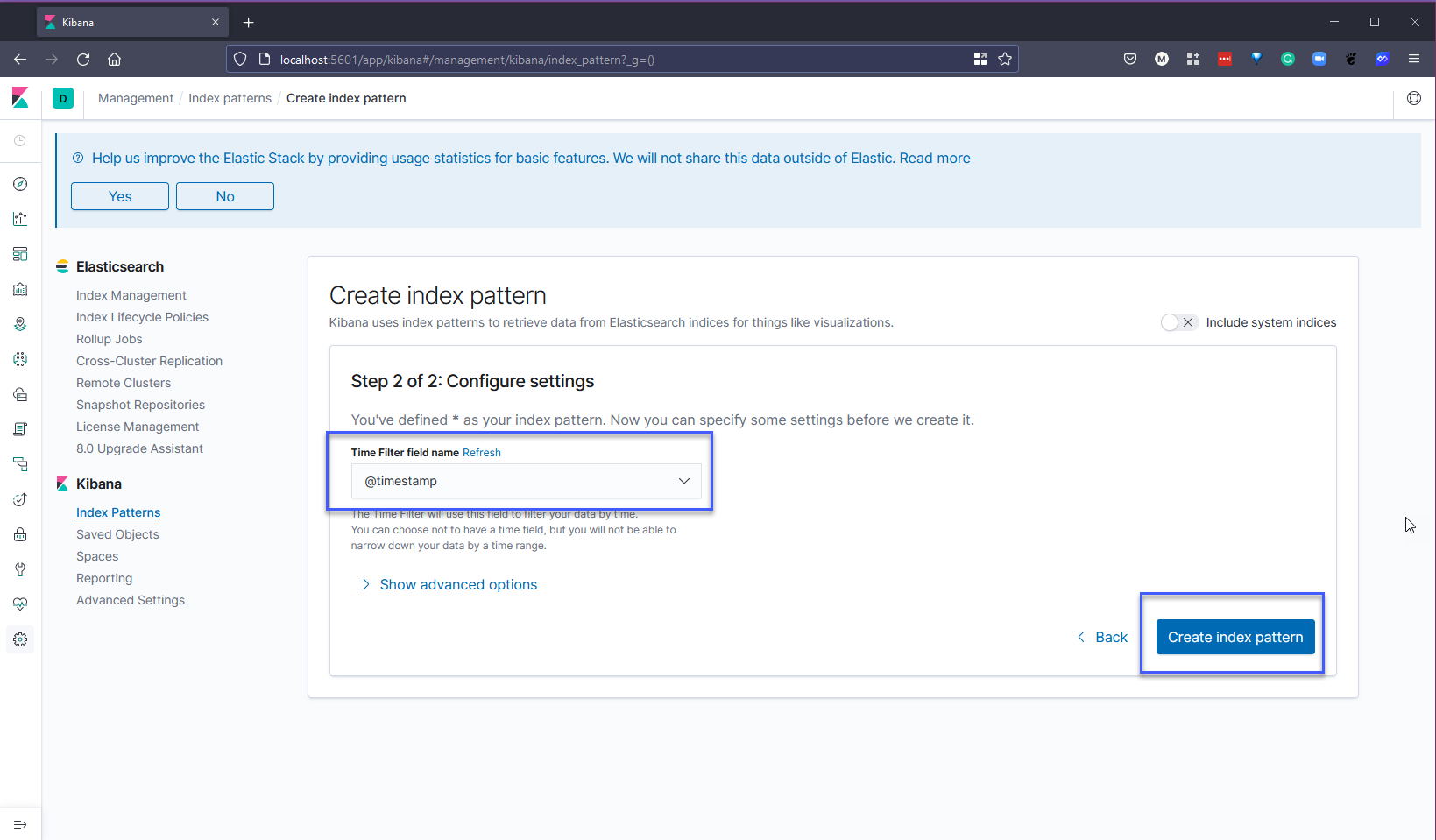 Ở bước 2/2, chúng ta sẽ sử dụng tùy chọn @timestamp từ dropdown vì tùy chọn này sẽ lọc dữ liệu của chúng ta theo thời gian. Khi bạn nhấn "Create pattern", có thể mất vài giây để hoàn thành.