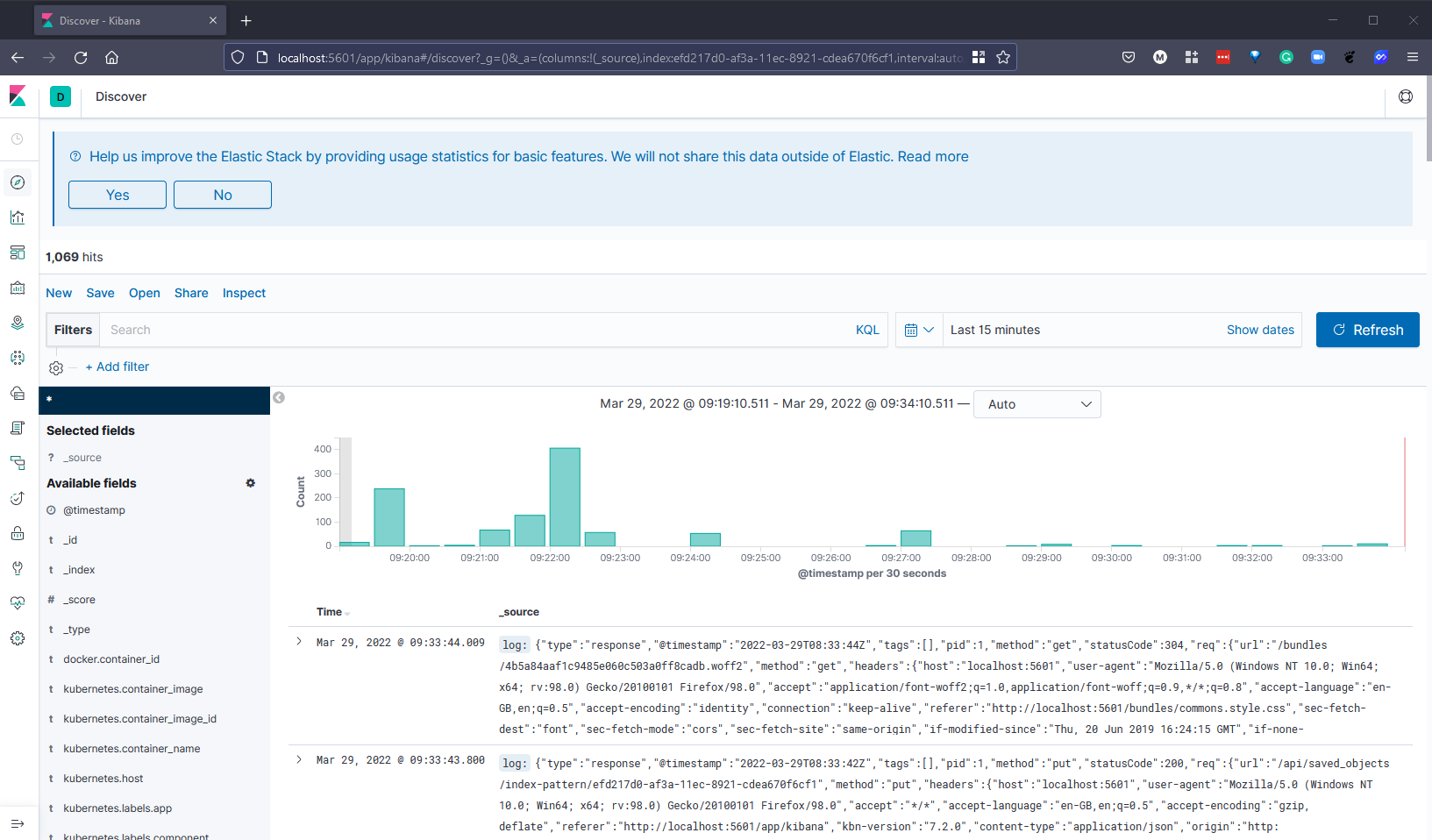 Nếu bây giờ chúng ta quay lại tab "Discover" sau vài giây, bạn sẽ bắt đầu thấy dữ liệu đến từ Kubernetes cluster của mình.