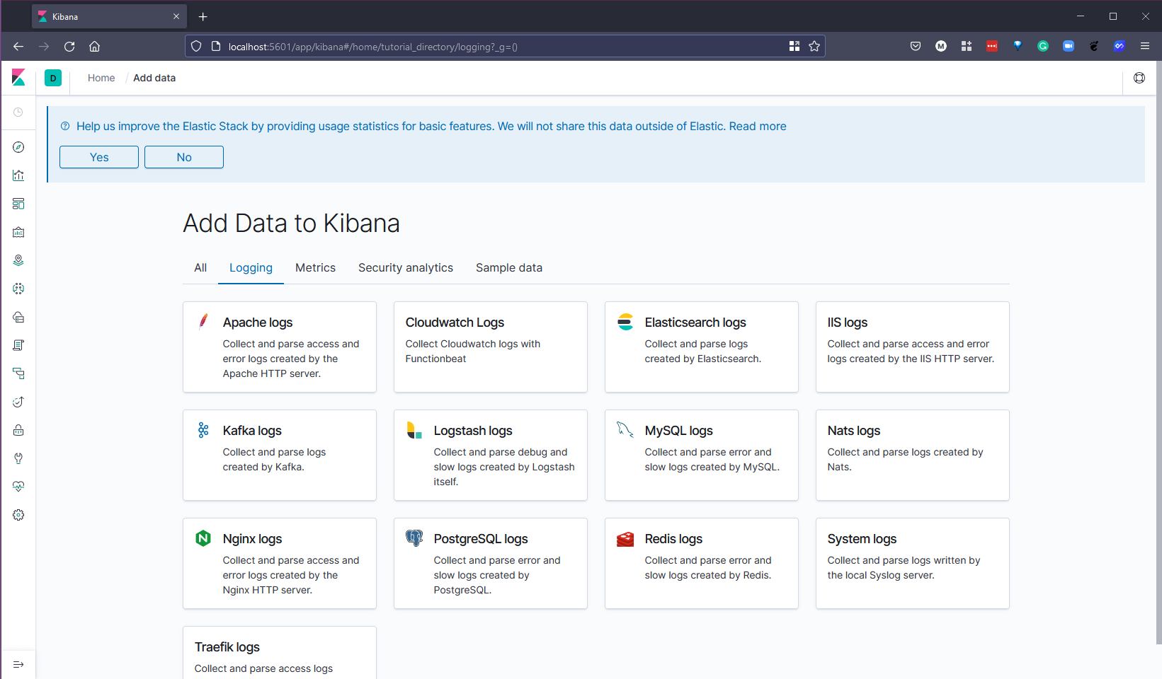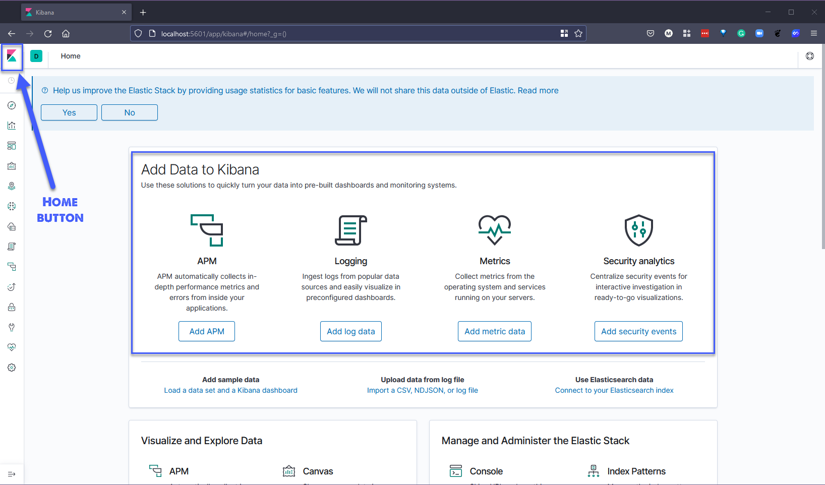 Chúng ta đã thiết lập và chạy EFK, cũng như đang thu thập logs từ cụm Kubernetes thông qua Fluentd. Chúng ta cũng có thể xem các nguồn khác mà chúng ta có thể chọn bằng cách điều hướng đến màn hình chính bằng cách nhấn vào biểu tượng Kibana ở trên cùng bên trái, bạn sẽ thấy trang web mà chúng ta đã thấy khi đăng nhập lần đầu.