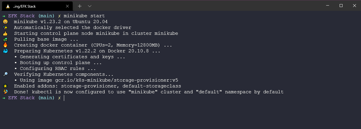 Chúng ta sẽ sử dụng Minikube cluster của mình để triển khai EFK stack. Hãy bắt đầu một cluster bằng cách sử dụng minikube start trên hệ thống. Tôi đang sử dụng hệ điều hành Windows có WSL2 được bật.