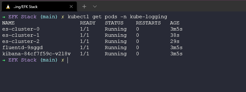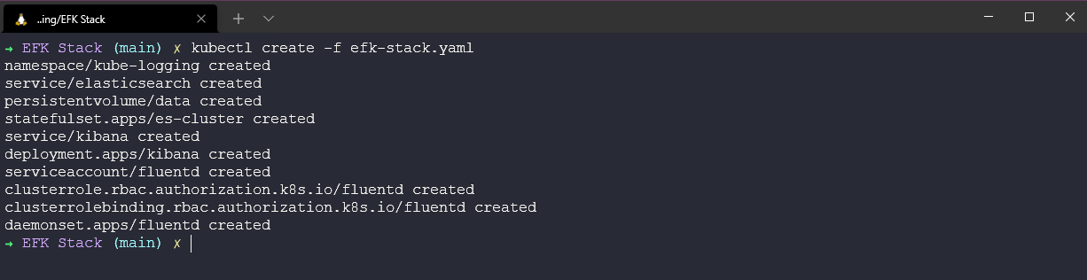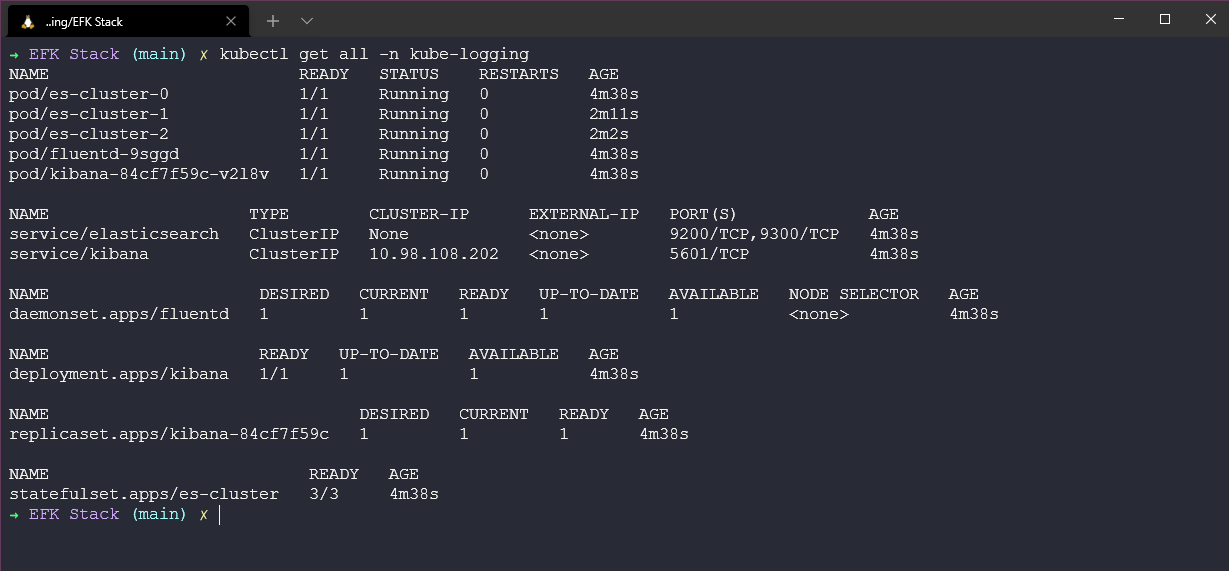 Tôi đã tạo efk-stack.yaml chứa mọi thứ chúng ta cần để triển khai EFK stack vào cluster. Bằng cách sử dụng lệnh kubectl create -f efk-stack.yaml, chúng ta có thể thấy mọi thứ đang được triển khai.