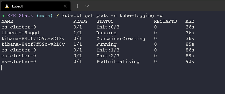 Thời gian triển khai trên hệ thống của bạn sẽ tuỳ thuộc vào việc nếu bạn đã chạy hệ thống này hoặc đã pull images, bây giờ bạn nên kiểm tra xem các pods đã ở trạng thái sẵn sàng chưa trước khi chúng ta có thể tiếp tục. Bạn có thể kiểm tra bằng lệnh kubectl get pod -n kube-logging -w. Quá trình này có thể mất vài phút.