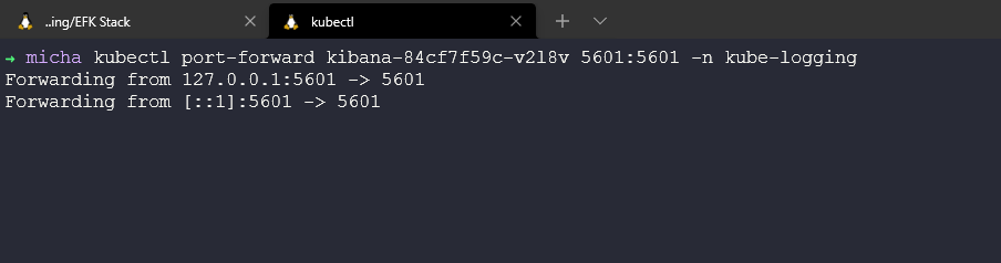 Bây giờ, khi tất cả các pods đã hoạt động, chúng ta có thể thực hiện lệnh chuyển tiếp cổng với một terminal mới để có thể truy cập bảng điều khiển Kibana. Lưu ý rằng tên pod của bạn sẽ khác với những gì trong lệnh được sử dụng ở đây. kubectl port-forward kibana-84cf7f59c-v2l8v 5601:5601 -n kube-logging