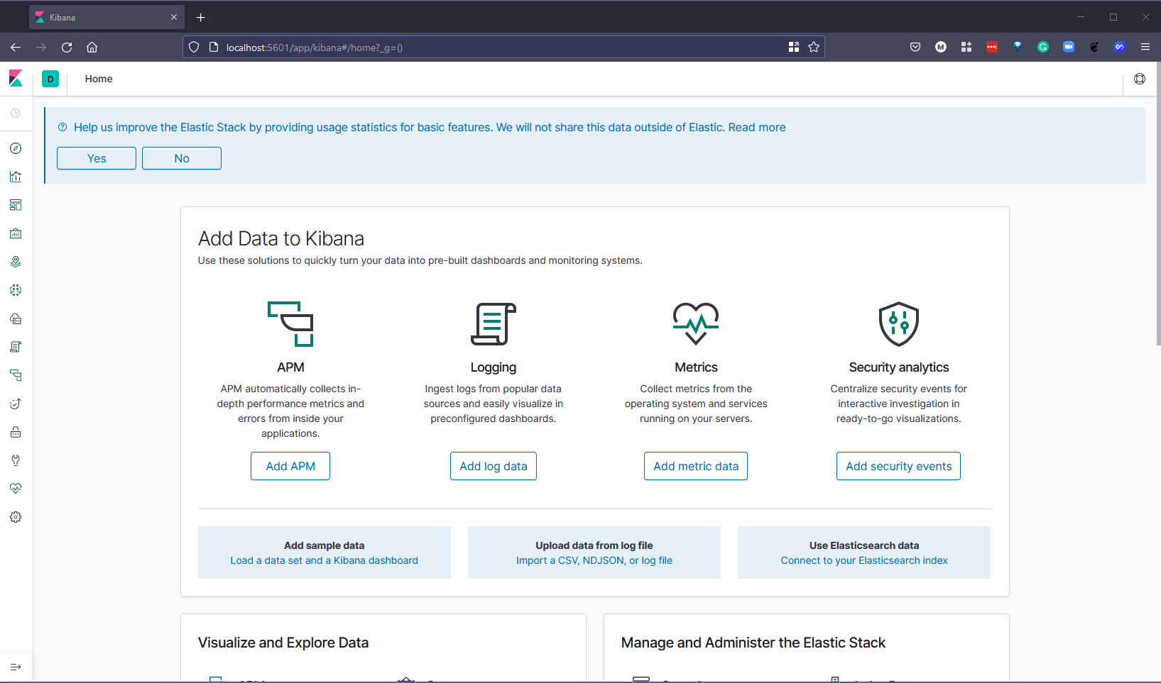 Bây giờ, chúng ta có thể mở trình duyệt và truy cập địa chỉ http://localhost:5601, bạn sẽ thấy màn hình như bên dưới hoặc bạn có thể thấy màn hình dữ liệu mẫu. Hãy tiếp tục và tự định cấu hình. Dù có như thế nào, hãy xem xét dữ liệu mẫu, đó là những gì chúng ta đã đề cập khi xem xét ELK stack trong bài viết trước.