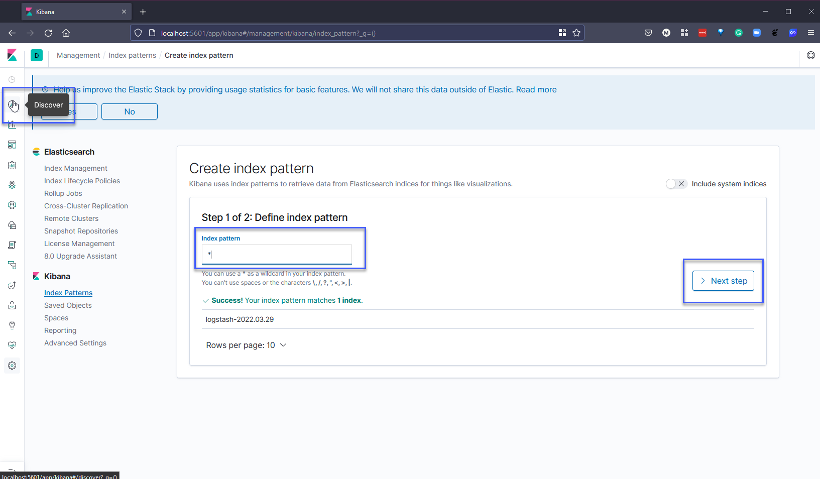 Tiếp theo, chúng ta cần nhấn vào tab "Discover" trên menu bên trái và thêm "*" vào mục index pattern. Tiếp tục sang bước tiếp theo bằng cách nhấn "Next step".
