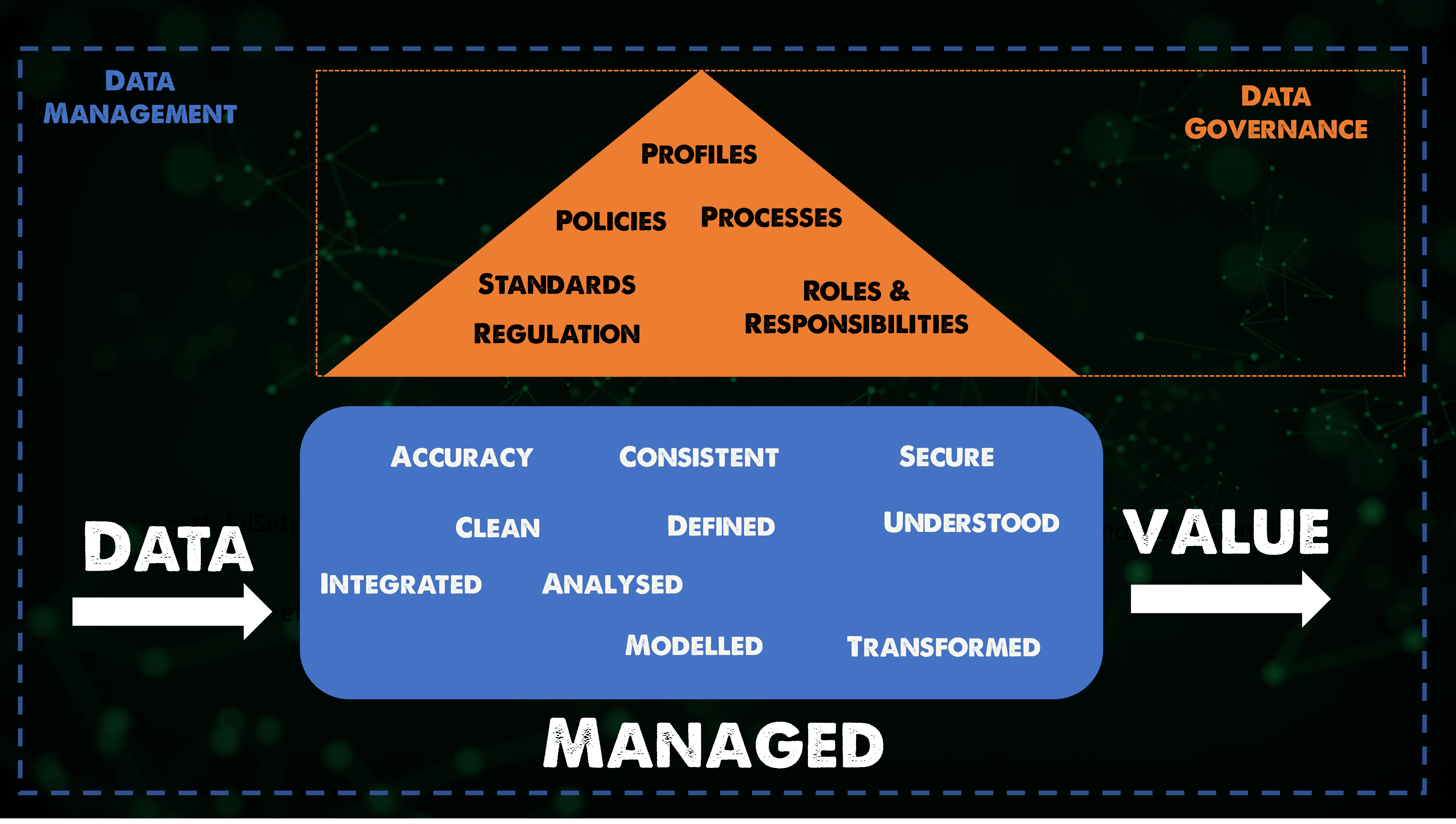 Quản lý dữ liệu theo Data Management Body of Knowledge là "sự phát triển, thực thi và giám sát các kế hoạch, chính sách, chương trình và thực tiễn để kiểm soát, bảo vệ, cung cấp và nâng cao giá trị của tài sản dữ liệu và thông tin."