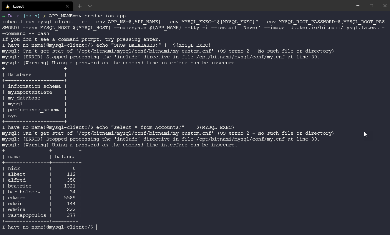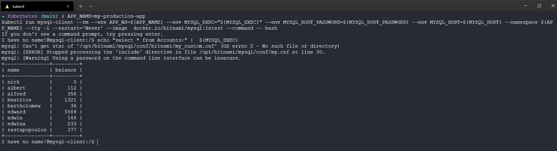 kubectl run mysql-client --rm --env APP_NS=${APP_NAME} --env MYSQL_EXEC="${MYSQL_EXEC}" --env MYSQL_ROOT_PASSWORD=${MYSQL_ROOT_PASSWORD} --env MYSQL_HOST=${MYSQL_HOST} --namespace ${APP_NAME} --tty -i --restart='Never' --image docker.io/bitnami/mysql:latest --command -- bash