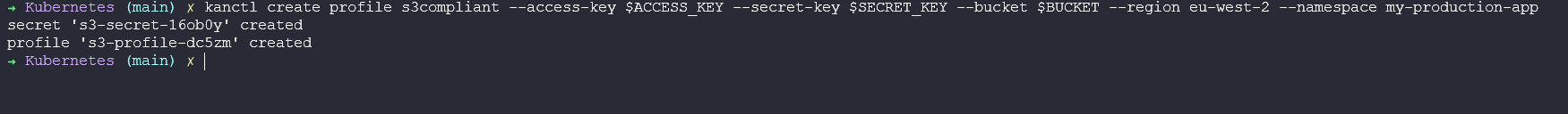 kanctl create profile s3compliant --access-key $ACCESS_KEY --secret-key $SECRET_KEY --bucket $BUCKET --region eu-west-2 --namespace my-production-app