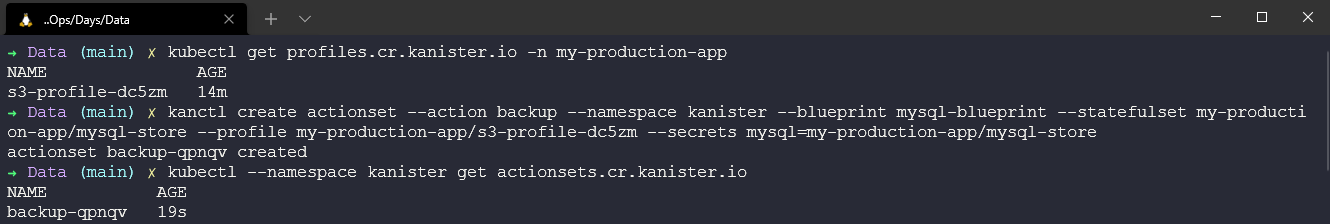 kanctl create actionset --action backup --namespace kanister --blueprint mysql-blueprint --statefulset my-production-app/mysql-store --profile my-production-app/s3-profile-dc5zm --secrets mysql=my-production-app/mysql-store