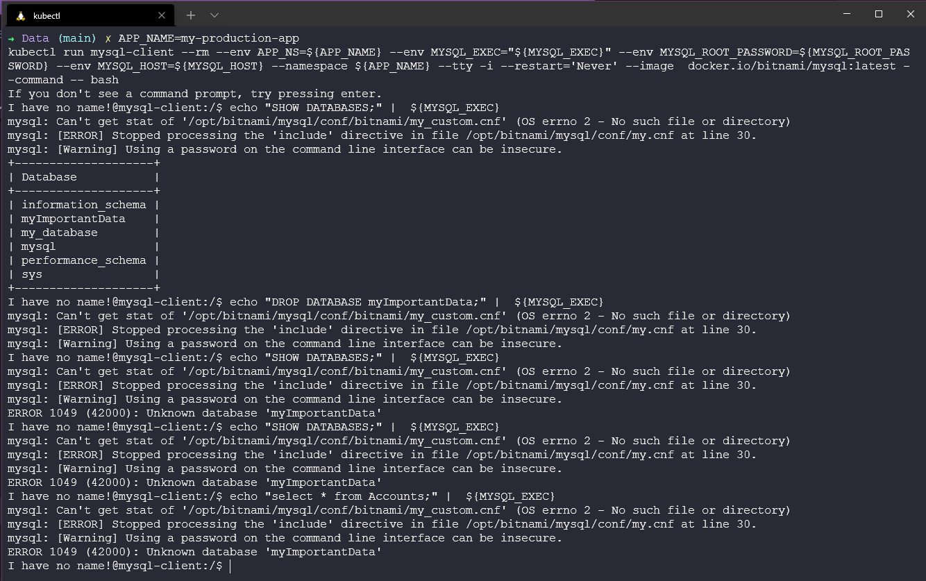 Bây giờ chúng ta đang ở trong MySQL Client, chúng ta có thể thực hiện lệnh echo "SHOW DATABASES;" | ${MYSQL_EXEC} và chúng ta có thể thấy cơ sở dữ liệu đã quay lại. Chúng ta cũng có thể thực hiện lệnh echo "select * from Accounts;" | ${MYSQL_EXEC} để kiểm tra nội dung của cơ sở dữ liệu và dữ liệu quan trọng của chúng ta đã được khôi phục.