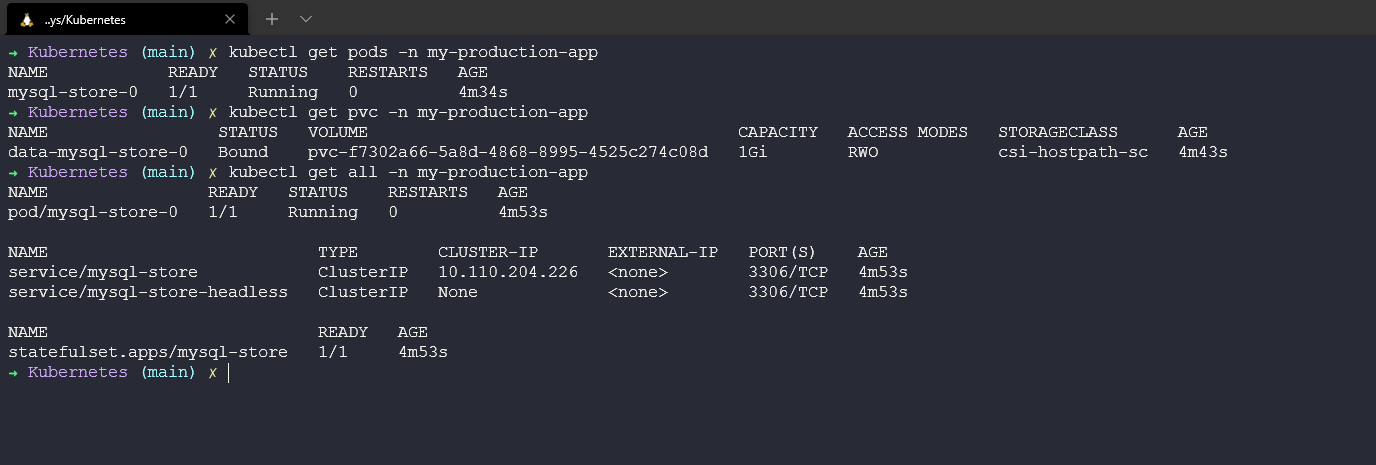 Bạn có thể thấy từ lệnh trên chúng ta đang định nghĩa blueprint mà chúng ta đã thêm vào namespace, statefulset trong namespace my-production-app của chúng ta và cả các secrét để truy cập vào ứng dụng MySQL.