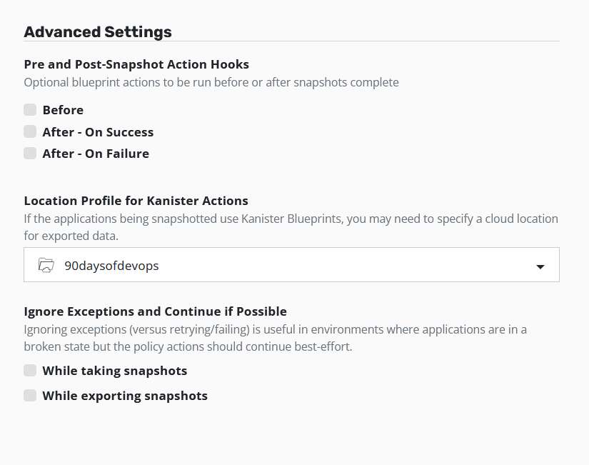 Dưới Advanced settings, chúng ta sẽ không sử dụng bất kỳ cài đặt nào trong số này nhưng dựa trên hướng dẫn của Kanister trong bài viết trước, chúng ta có thể tận dụng Kanister như một phần của Kasten K10 để lấy các bản sao nhất quán của dữ liệu của chúng ta.