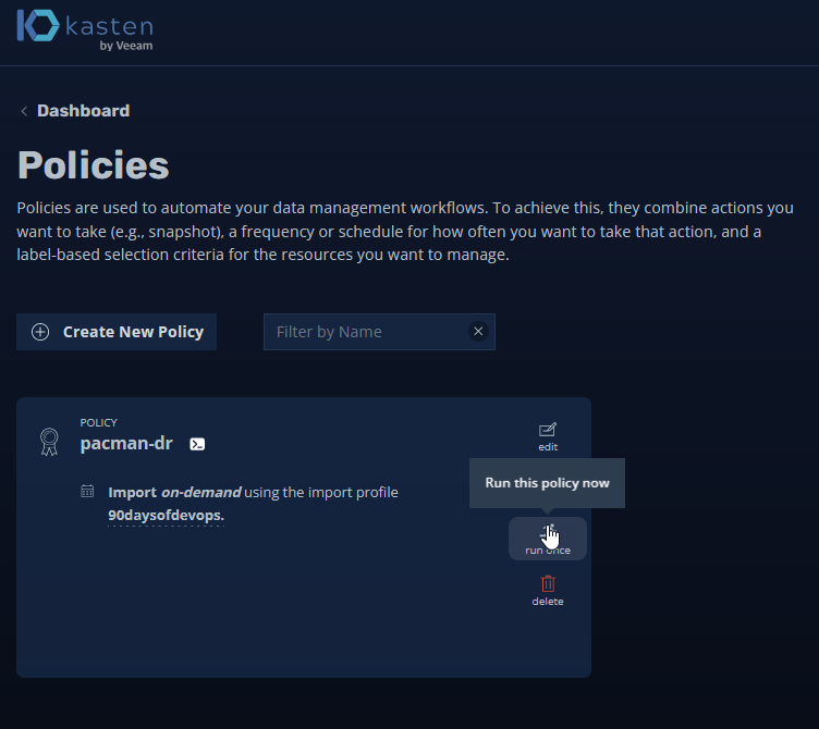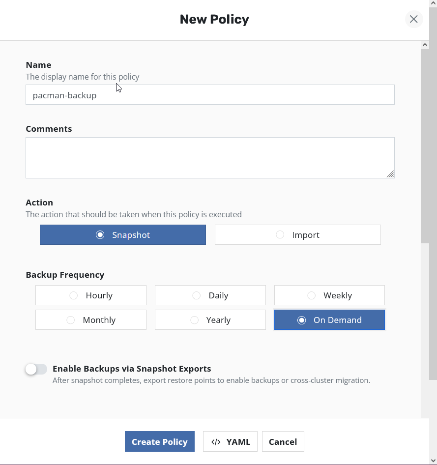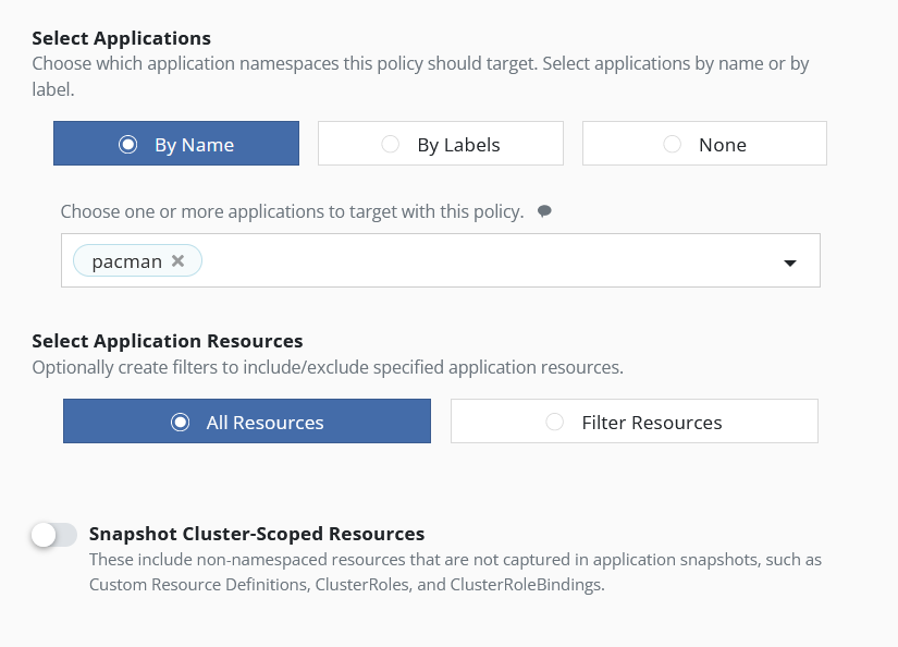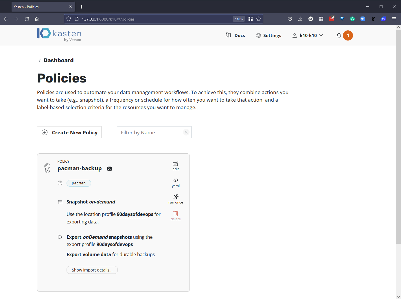 Trong phiên trước, chúng ta chỉ tạo một bản snapshot ngẫu nhiên của ứng dụng Pac-Man, vì vậy chúng ta cần tạo một chính sách sao lưu sẽ gửi các bản sao lưu ứng dụng của chúng ta đến vị trí obeject strorage mới tạo của chúng ta.