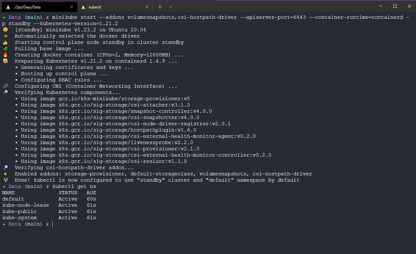 Sử dụng minikube start --addons volumesnapshots,csi-hostpath-driver --apiserver-port=6443 --container-runtime=containerd -p standby --kubernetes-version=1.21.2, chúng ta có thể tạo cụm mới của mình.