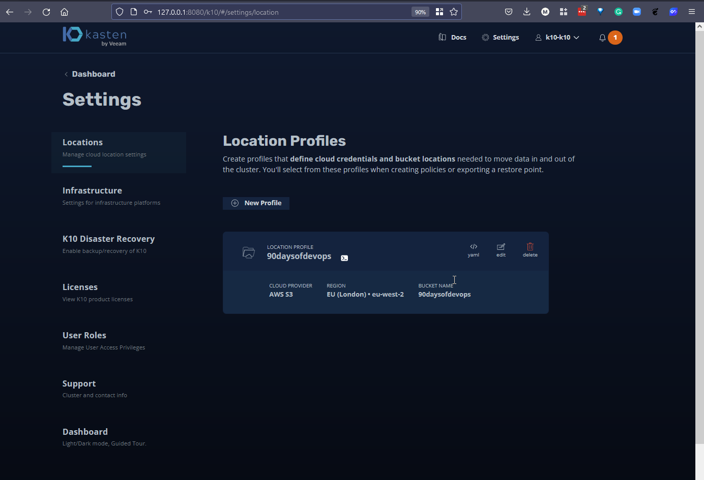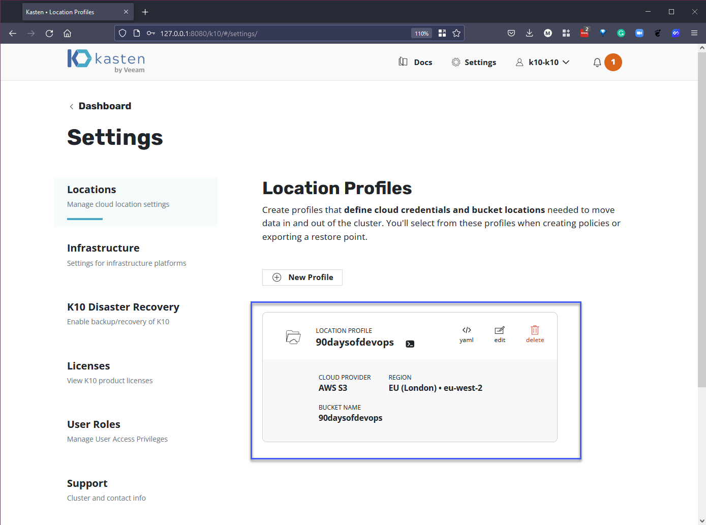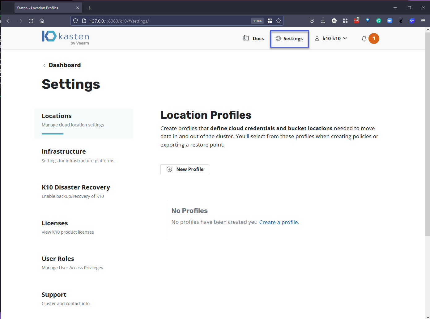 Bây giờ khi chúng ta đã quay lại bảng điều khiển Kasten K10, chúng ta có thể thêm hồ sơ vị trí của mình, chọn "Settings" ở đầu trang và "New Profile".