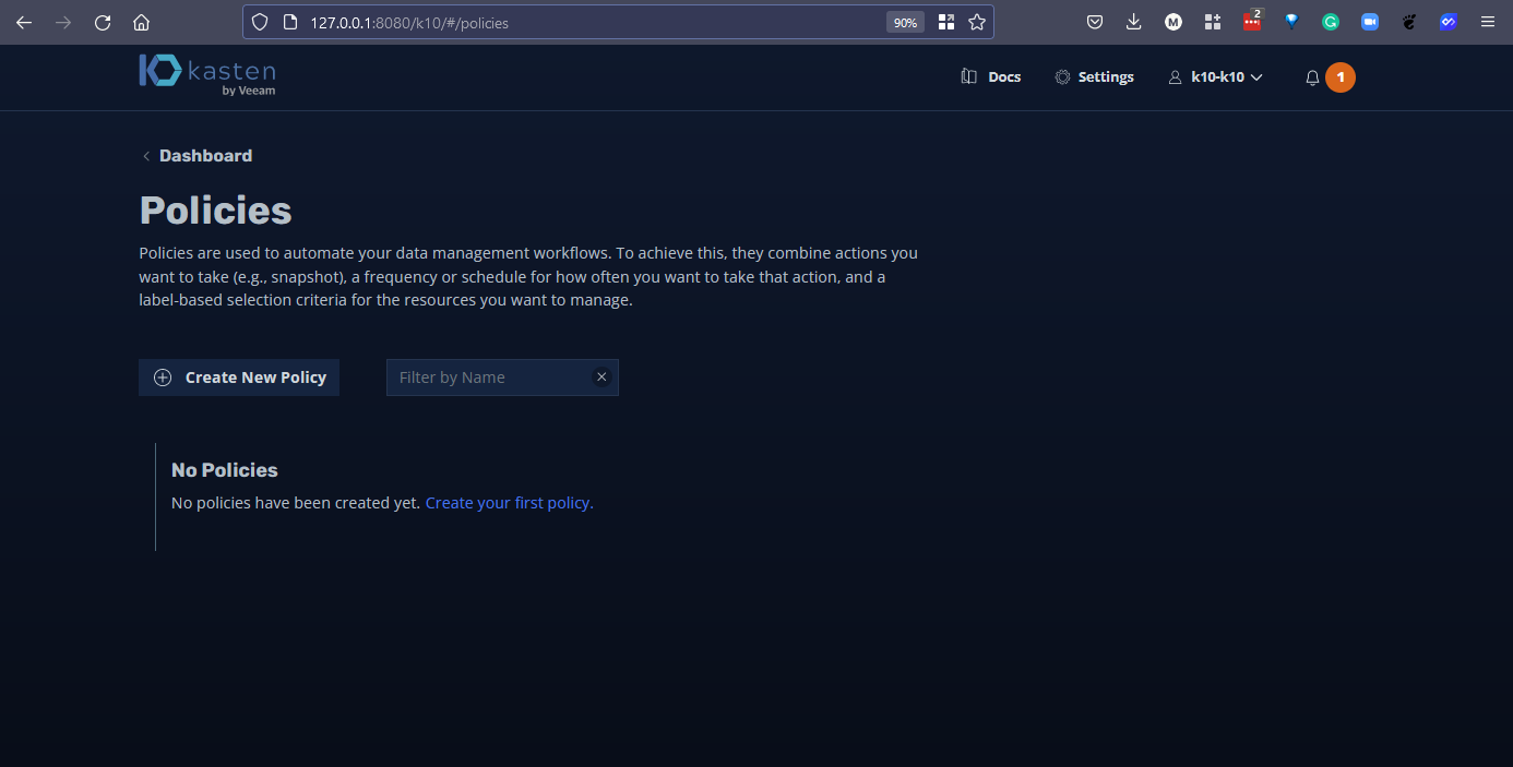 Bảng điều khiển Kasten sẽ khả dụng tại http://127.0.0.1:8080/k10/#/