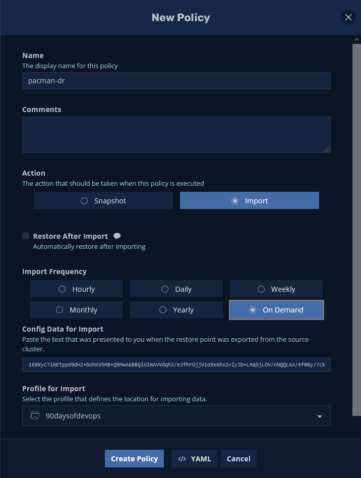 Tại thời điểm này, chúng ta có thể tạo một chính sách import vào cụm dự phòng đó và kết nối với các bản sao lưu trên object storage bucket và xác định những gì và cách chúng ta muốn điều này trông như thế nào.