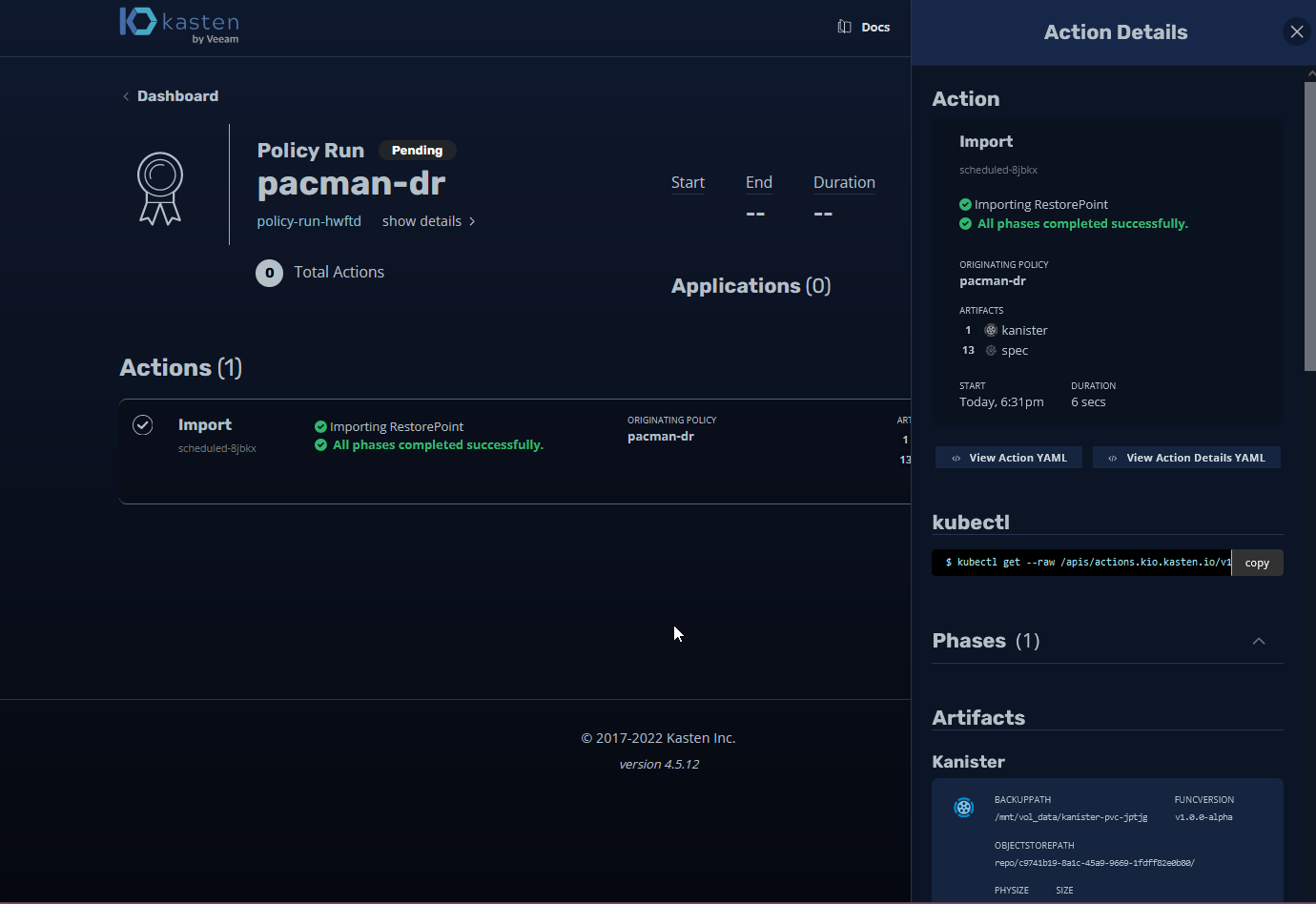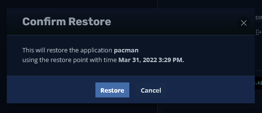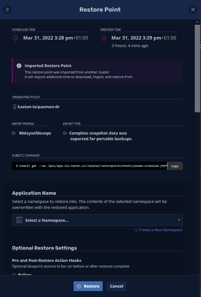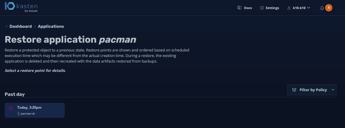 Tại đây, chúng ta có thể thấy các điểm khôi phục mà chúng ta có sẵn; đây là công việc sao lưu mà chúng ta đã chạy trên cụm chính đối với ứng dụng Pac-Man của chúng ta.