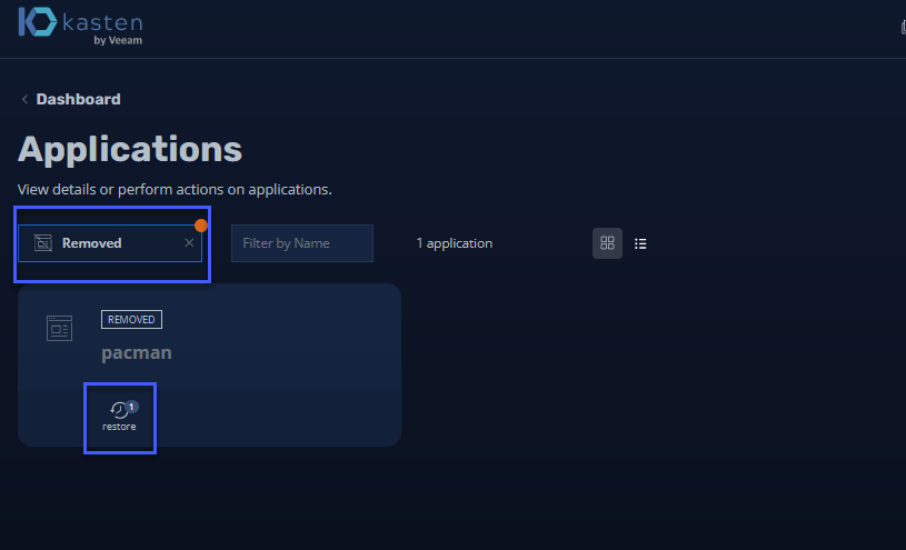 Nếu chúng ta quay lại bảng điều khiển và vào thẻ Applications, chúng ta có thể chọn thả xuống nơi bạn thấy bên dưới "Removed" bạn sẽ thấy ứng dụng của chúng ta ở đây. Chọn Restore
