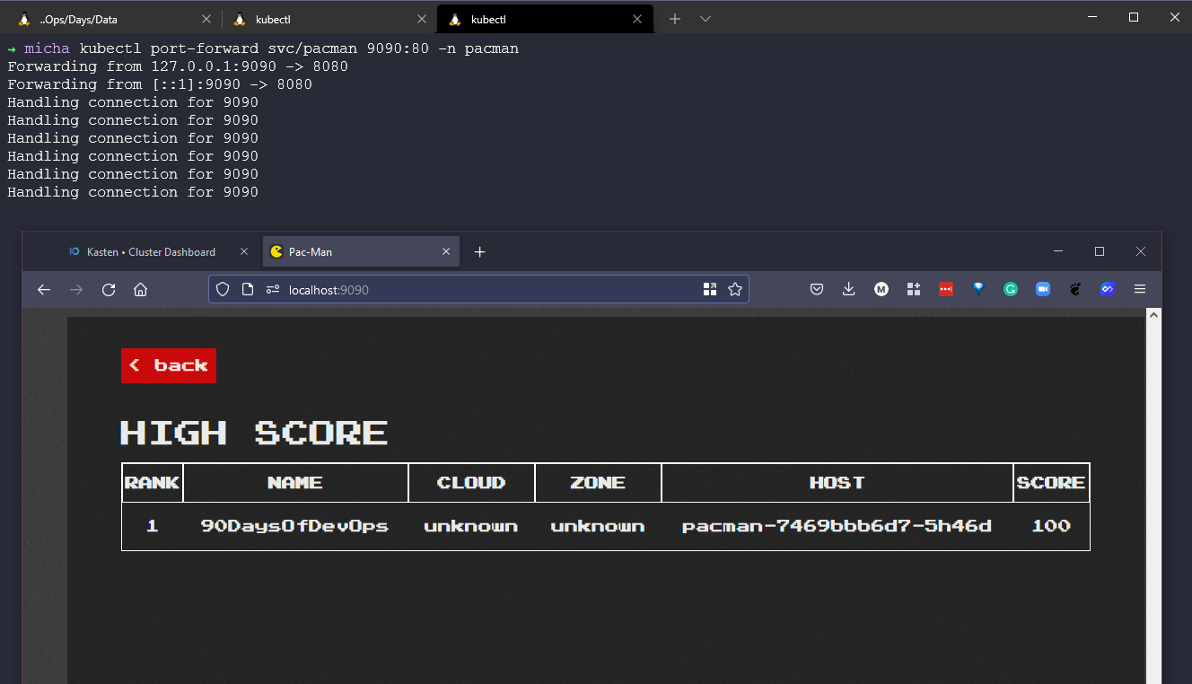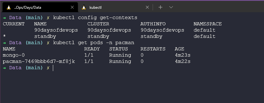 Chúng ta có thể thấy bên dưới rằng chúng ta đang ở trong cụm dự phòng và nếu chúng ta kiểm tra các pod của mình, chúng ta có thể thấy rằng chúng ta đã có ứng dụng đang chạy.